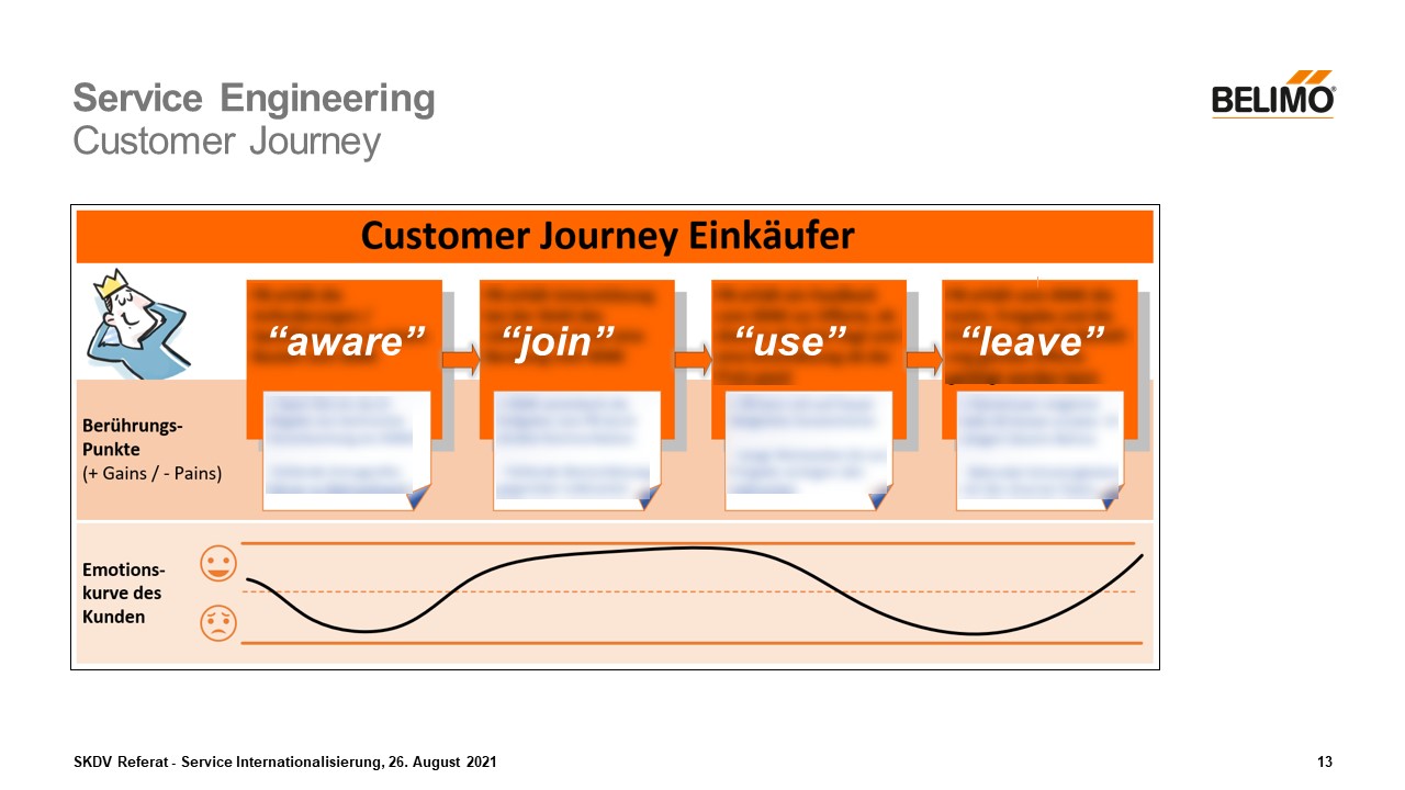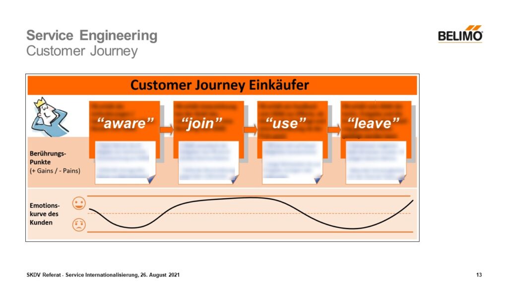 Ein weiteres praktisches Werkzeug für die Dienstleistungsentwicklung ist die Customer Journey (Kundenerlebniskette). Die Journey verfolgt das Ziel, die Problembereiche und Chancen zu identifizieren. Ebenso sollen die Pains vermindert werden, neue Gains zum Vorschein kommen und die Emotionskurve des Kunden in den jeweiligen Schritten ermittelt werden. Dabei stellt die Customer Journey keine detaillierte Prozessbeschreibung dar, sondern sie zeigt die groben Interaktionspunkte des Kunden mit dem angebotenen Service auf. Die typische Journey besteht meist aus vier bis acht Schritte, wobei die generische Form aus den folgenden vier Schritten besteht