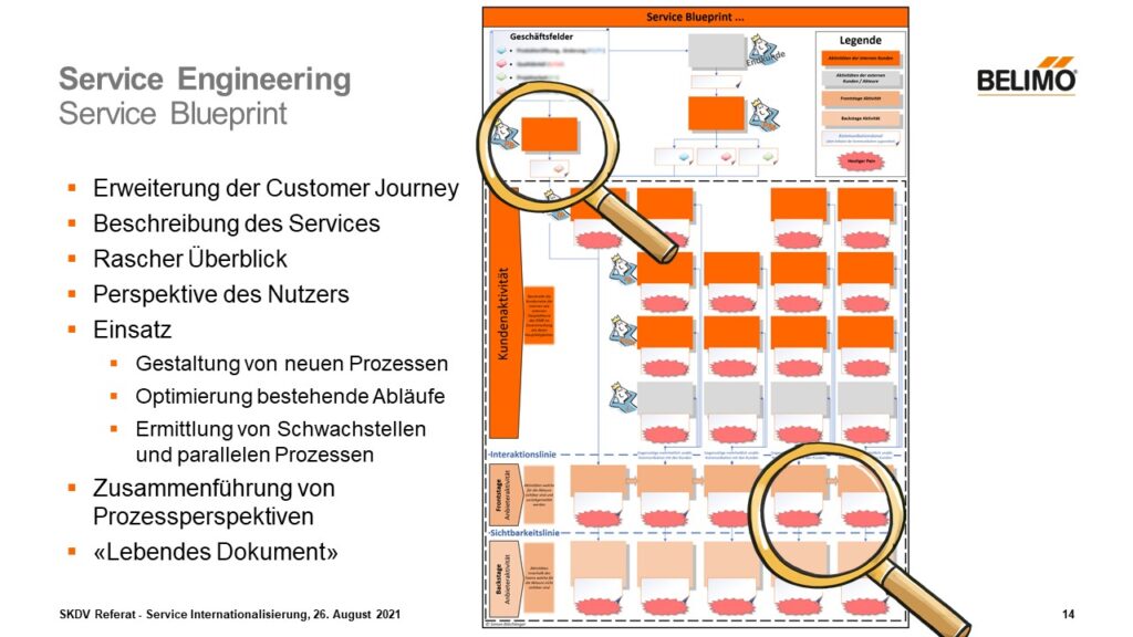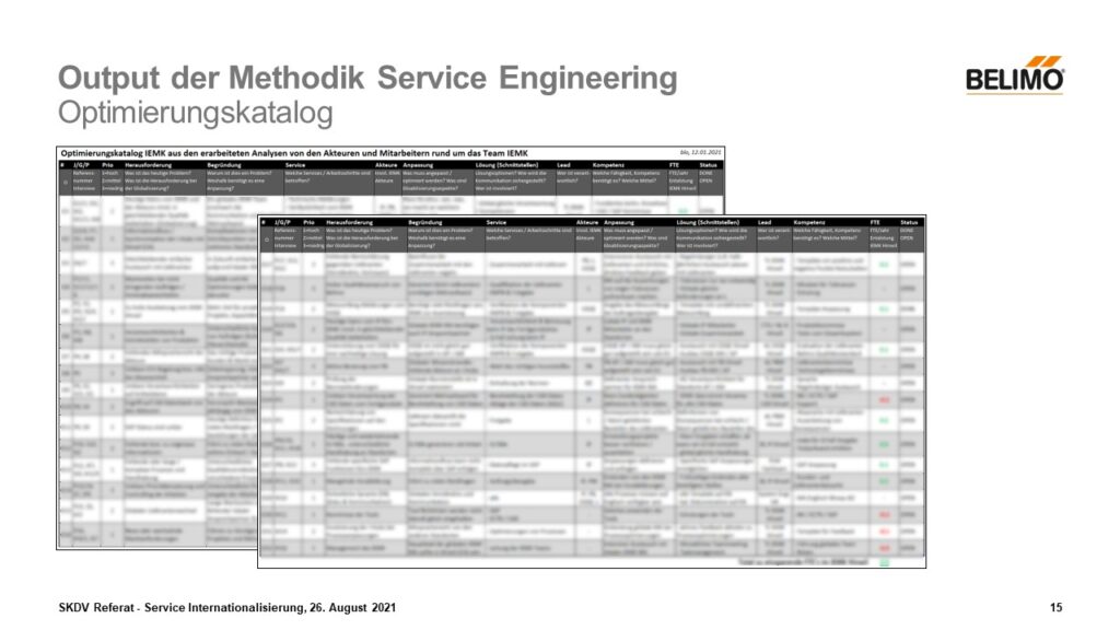 Dies ermöglichte eine wissenschaftliche und vor allem einfache Ableitung des Optimierungskatalogs. Ebenso ein grosser Vorteil des erstellten Service-Blueprint ist es, dass Diskussionen mit dem Management bzgl. Globalisierung viel einfacher zu führen sind und Optimierungen auch schneller identifiziert werden.