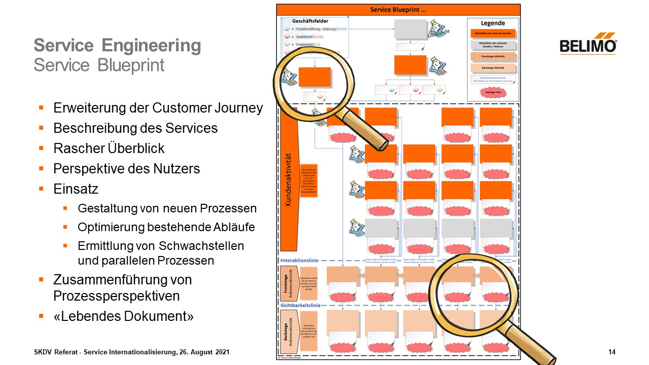 Der Service Blueprint, von welchem sie hier ein Beispiel sehen, ist eine Erweiterung der Customer Journey und zeigt eine Übersicht oder eine grafische Abbildung, welche das Dienstleistungssystem des Services akkurat abbildet. Darin wird beschrieben, wie der Service am Berührungspunkt mit den Kunden sowie im Unternehmen hinter den Kulissen erbracht wird. Der grosse Nutzen dieser «Übersichtskarte» ist es, dass alle beteiligten Personen die zu bearbeitende Dienstleistung verstehen und somit auch bearbeiten können, auch wenn nicht alle den gleichen Standpunkt besitzen. Der Service Blueprint ermöglicht also einen raschen Überblick über den kompletten Service zu haben, ohne sich gross einzulesen oder zu studieren. Wie bei jeder Service Engineering Methode, stehen auch hier diejenigen Prozesse im Vordergrund, welche aus Perspektive des Nutzers modelliert werden. Ebenso werden die des Dienstleistungsbereitstellers und anderer relevanter Gruppen (Dritthersteller, Partner) aufgezeigt, wobei die Interaktionspunkte genauso wie die Hintergrundprozesse abgebildet werden. Zum Einsatz kommt der Service Blueprint bei der Gestaltung von neuen Prozessen, als auch für die Optimierung von bestehenden Abläufen. Einerseits dient der Service Blueprint dazu, neue Kunden in einer Dienstleistung zu integrieren, anderseits ist der Blueprint auch ein Hilfsmittel, um Prozesse leichtverständlich und eingängig darzustellen. So können Schwachstellen ermittelt und parallele Prozesse erkennt werden. Zusätzlich ist es eine Hilfestellung, um für den Kunden sichtbare und nicht sichtbare Aktivitäten aufzudecken. Es lohnt sich den Service Blueprint abteilungsübergreifend in Workshops zu gestalten, da auf diese Weise möglichste viele Prozessperspektiven zusammengeführt werden und die Beteiligten werden auch gleich ihrer Verantwortlichkeit bewusst. Wichtig hierbei zu erwähnen ist, dass der Service Blueprint ein „lebendes“ Dokument ist, welches in regelmässigen Abständen überarbeitet werden sollte.