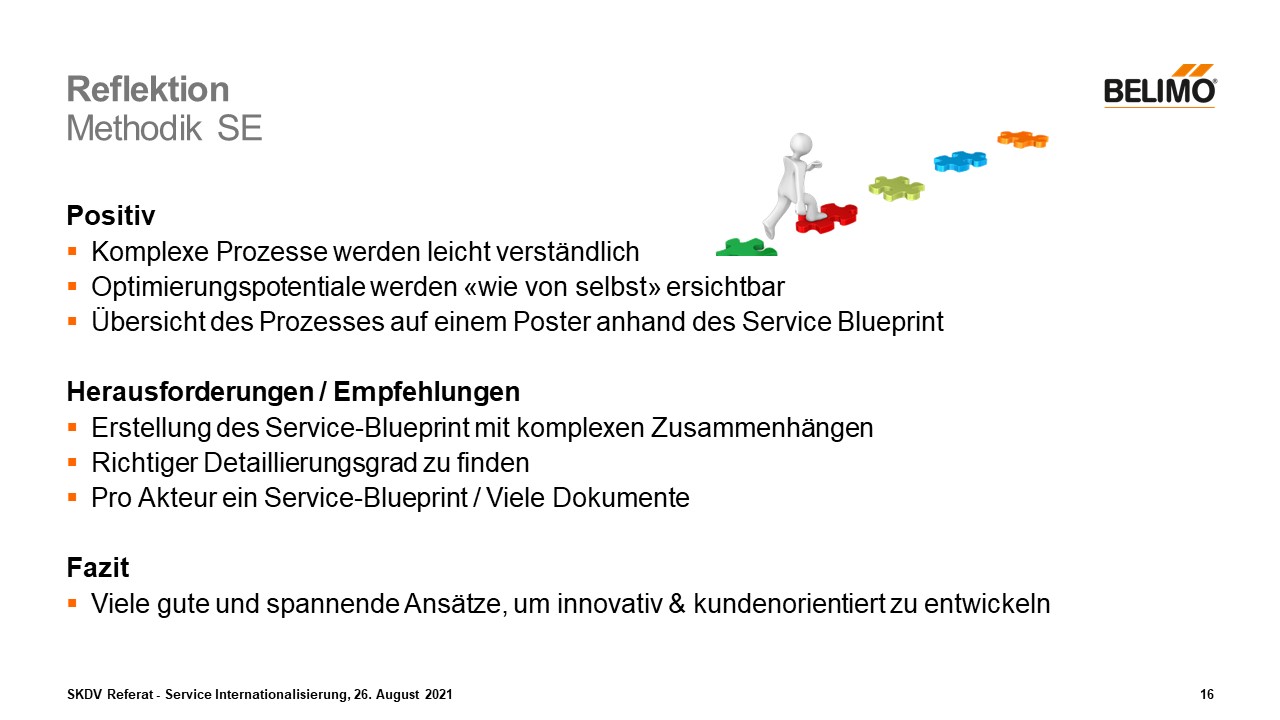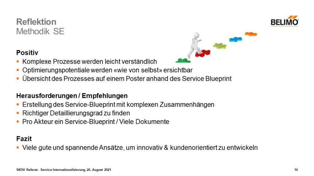 Im Allgemeinen bringt die Methodik Service Engineering viele gute und spannende Ansätze mit sich, um innovativ und vor allem kundenorientierte Dienstleistungen zu entwickeln. So hat mir die Methode auch sehr geholfen, bei der heutigen Ist-Analyse. Deshalb würde ich die Methodik wieder verwenden, jedoch mit dem Bewusstsein, dass es ein enormen Aufwand mit sich bringt und ebenso ein aufwändiger Lernprozess dahinter steckt.