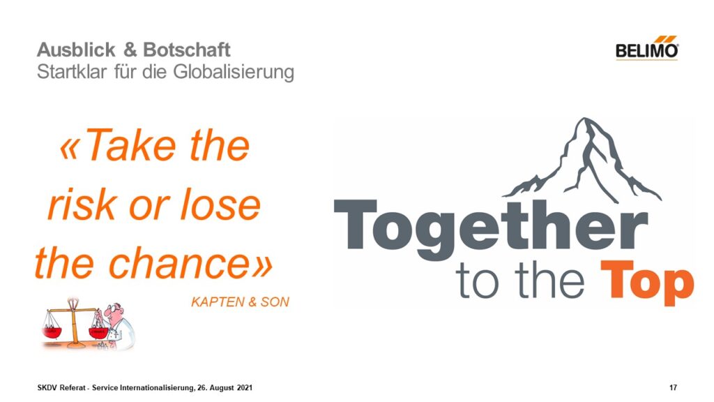 Take the risk or lose the chance – ganz nach dem Sprichwort wer nichts riskiert, kann nichts gewinnen. Natürlich wurde Im Zusammenhang mit der Globalisierung auch noch die Chancen und Risiken untersucht, sowie konkrete strategische Anpassungen und eine zukünftige Organisationsstruktur, so dass mit der Arbeit faktenbasiert gesagt werden kann, dass die Dienstleistung global ausgerichtet werden kann, wenn die Optimierungspunkte abgearbeitet worden sind. Wir sind also startklar für die Globalisierung – wozu sicherlich auch ein wenig Mut gehört.