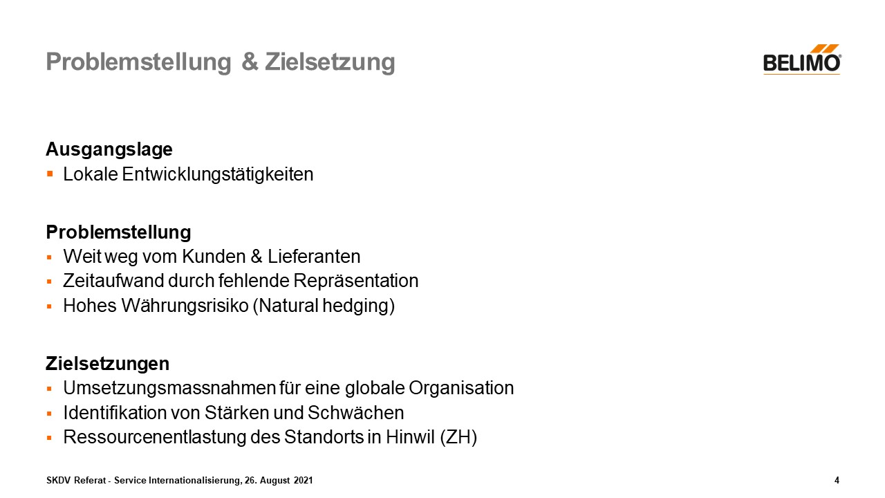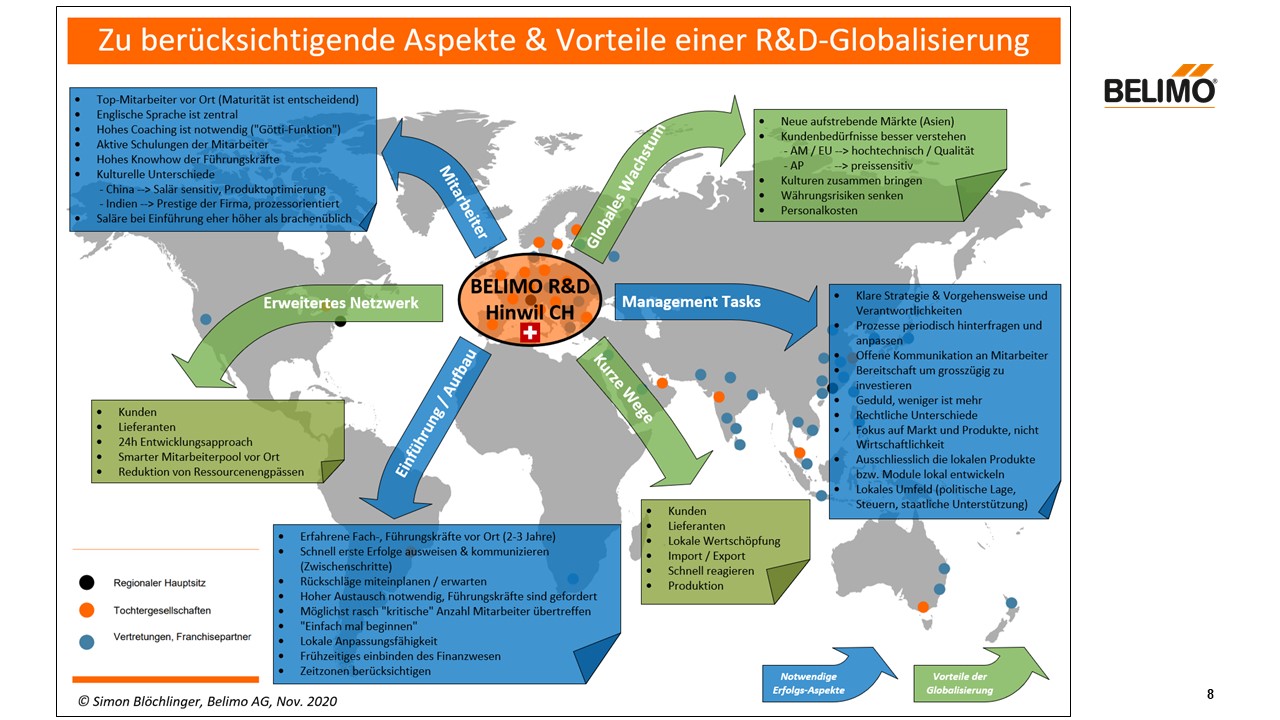 Obwohl Belimo weltweit tätig ist und auch einen Grossteil des Umsatzes im Ausland macht, werden heute mehrheitlich die Entwicklungstätigkeiten in der Schweiz ausgeführt. Dies führt dazu, dass die heutigen Tätigkeiten weit weg vom Kunde und den Lieferanten sind, so dass ein hoher Zeitaufwand durch fehlende Repräsentation in den anderen Ländern zu Stande kommt. (z.B. durch Missverständnisse aufgrund der Kultur und Sprachen, Abhängigkeit von CH). Ebenso entsteht dadurch ein hohes Währungsrisiko, mit dem sogenannten Natural Hedging.