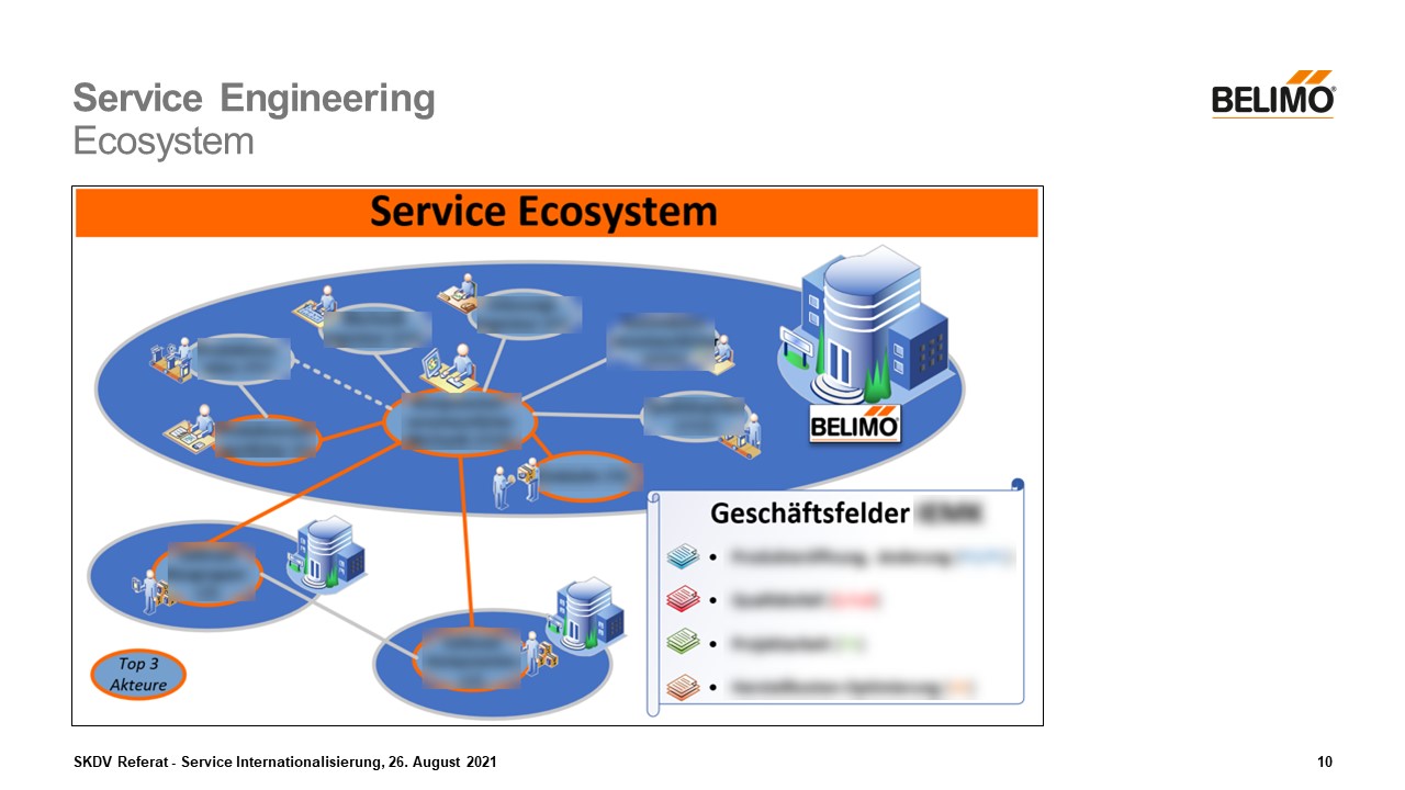 Im sogenannten Service Ecosystem werden die Services aufgezeigt, welches das Netzwerk von den verschiedensten Akteuren wiederspiegelt und durch die Bedürfnisse des Kunden gegeben ist. Dieses lässt sich aus den erforderlichen Drittherstellern und Partnerschaften vom jeweiligen Service ableiten und soll sicherstellen, dass jeder Akteur einen angemessen Wert generiert und auch erhält. Etwas einfacher erklärt: Das Ecosystem zeigt die verschiedenen Kunden der Dienstanbieters auf, welche in diesem Beispiel zu einem grossen Teil interne Kunden sind, sowie zwei weitere ausserhalb der Firma, welches Lieferanten sind.