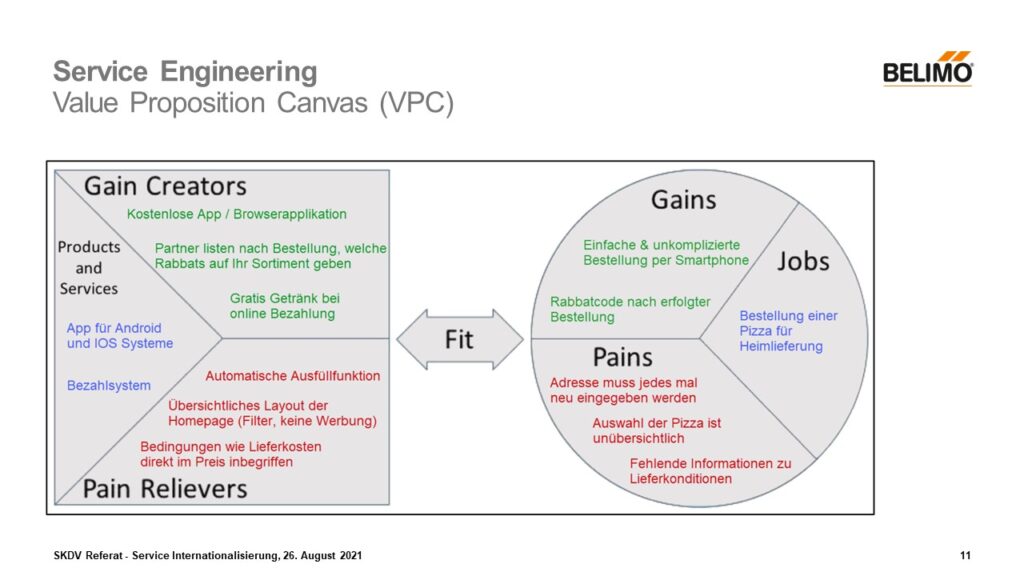 Die im Customer Profil erfassten Jobs, Pains und Gains welche aus den Interviews entstanden sind, werden im sogenannten „Value Proposition Canvas“ zusammengetragen. Auf Basis von diesem wird für die Service-Entwicklung eine Value Proposition entwickelt, welche auf der linken Seite gezielt auf die Bedürfnisse des Kunden eingeht. Die Spalte „Products and Services“ zeigt auf, wie die Jobs von den Kunden gelöst werden. Die „Pain Relievers“ gehen auf die „Pains“ ein und demzufolge veranschaulichen die „Gain Creators“ wie dem Kunden „Gains“ ermöglicht werden. Als einfaches Beispiel, könnte man hier die Online Bestellung einer Pizza betrachten. So kann heute ein Pain sein, dass die Adresse immer neu eingegeben werden muss bei der Bestellung, welche mit dem Pain Reliver «automatische Ausfüllfunktion» behoben wird. Usw.